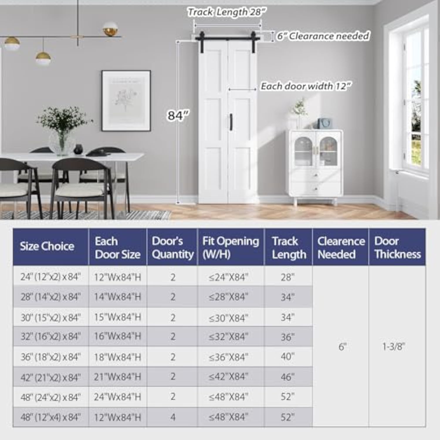 - How to Choose the Size : *"W (**"x*)x 84"H, thickness: 1 3/8". Track length: 28", The door opening width should be less then the track length(28") - 4", and Please make sure reserve at least 6" clearance needed from top of door and ceiling.