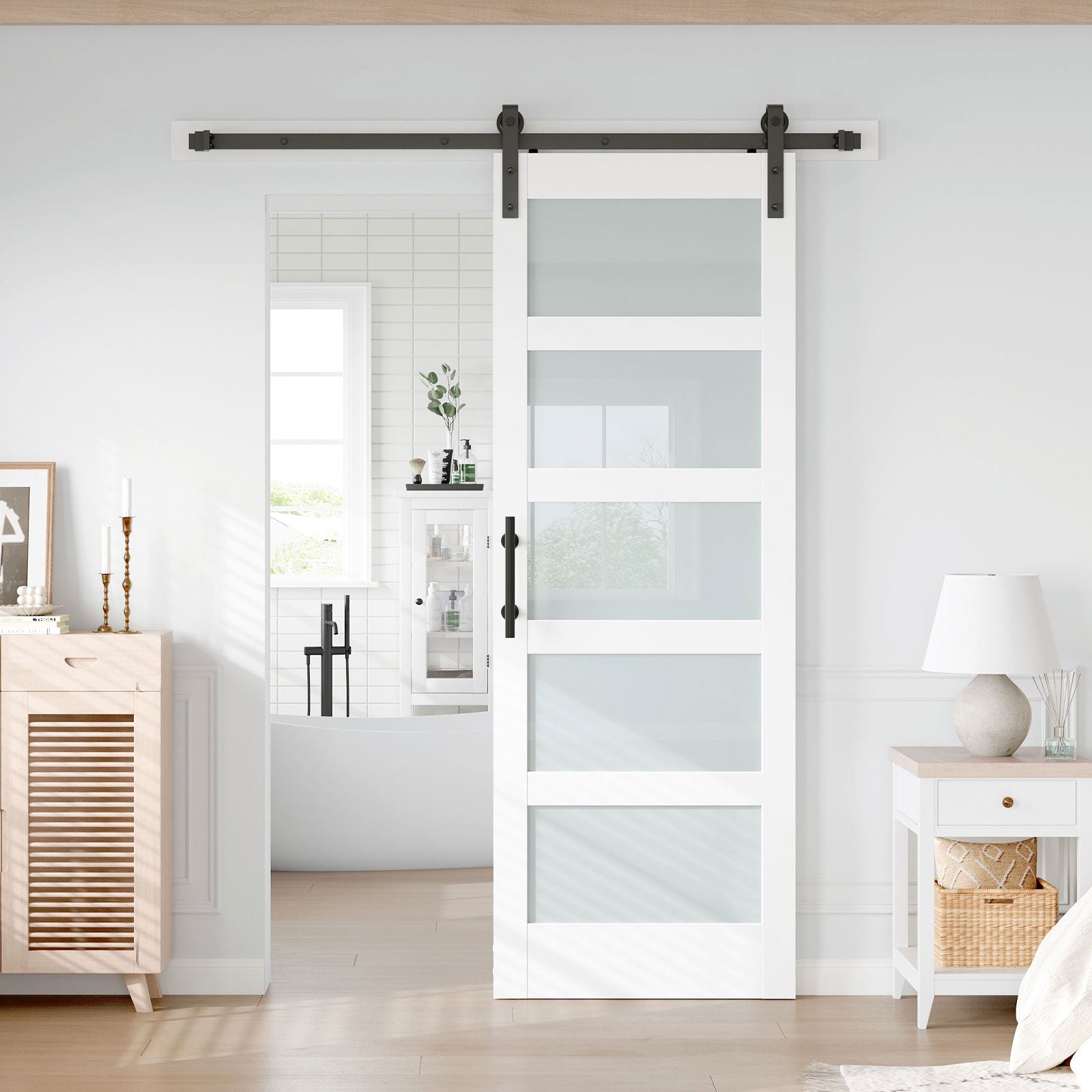 Fredbeck 30in x 84in White Glass Barn Door with 5.5FT 66inch Sliding Doors Hardware Kit Included & Handle,PVC Surface,Need to Assembly,Water-Proof